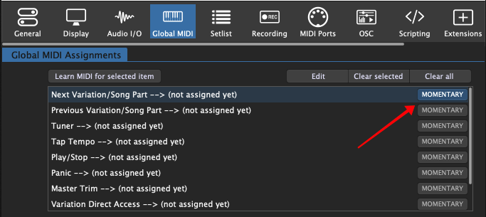 The global options Next and Previous can be mapped to buttons on your MIDI controller. However, if Gig Performer skips a variation, rackspace or song part, it means that the the Next and Previous commands are being triggered once when you press the button and then triggered again when you release the button. Click on the Momentary button beside the MIDI assignment to make Gig Performer respond only when pushing a button.